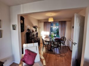 We started by painting the walls white, upgrading the lampshade and adding a lighter colour curtain. We also removed the old fashioned clock, pictures and other ornaments and added a small mirror and plants to the area, as well as a good quality rug, which helped to define the dining area as a separate space from the living area.